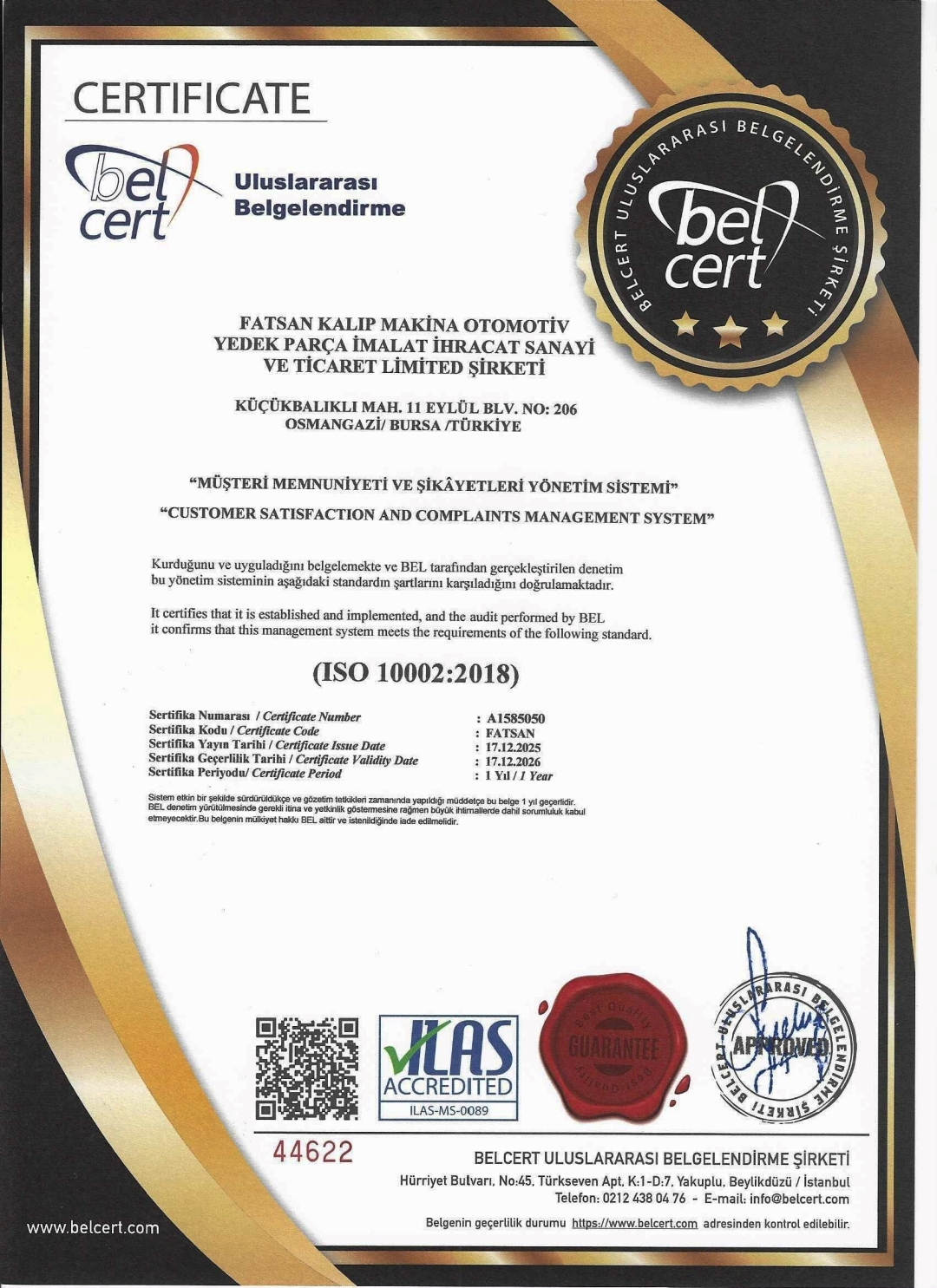 Firmamız, ISO 9001:2015 Kalite Yönetim Sistemi, ISO 10002:2018 Müşteri Memnuniyeti ve Şikayetleri Yönetim Sistemi, sertifikalarına sahiptir.